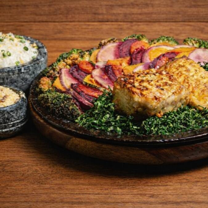Filhote grelhados com legumes refogados na manteiga da terra e crispy de couve.