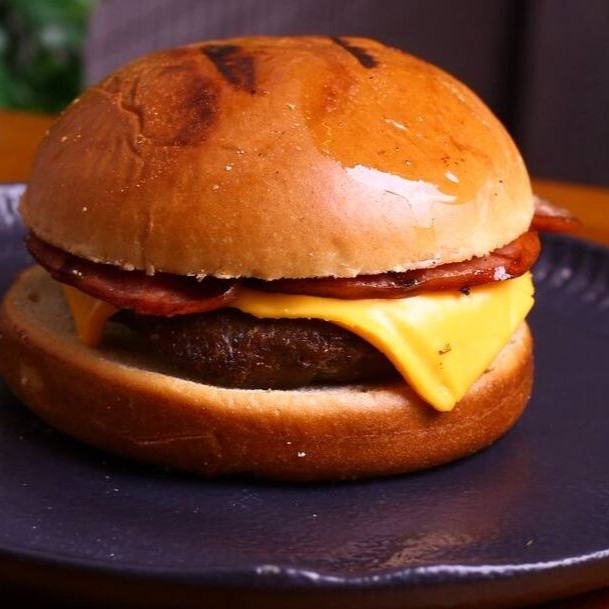 Pão brioche, blend maturado (150g), queijo cheddar e bacon.