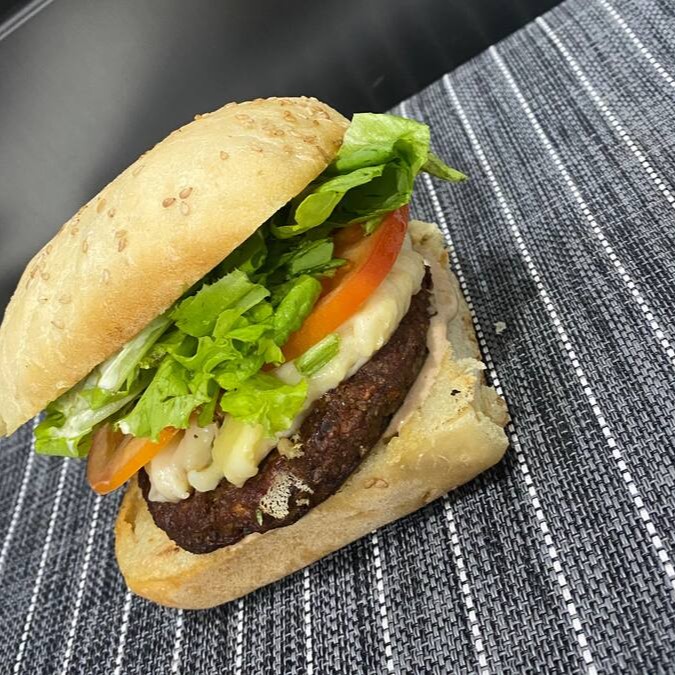 Hambúrguer: Pão Bola Especial do Vagão (120g), Hambúrguer 90g (base soja, legumes e temperos especiais), Picles, Molho Brown (base barbecue) e Molho Yellow do Vagão (base Mostarda).