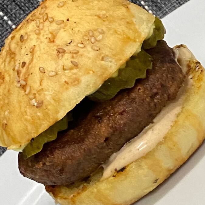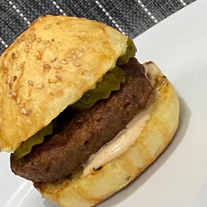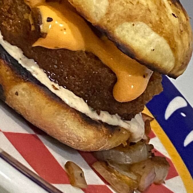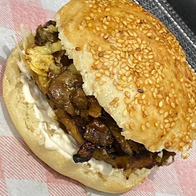 Pão, Hambúrguer de Frango Veg frito (100g), cebolas no shoyu, cheddar veg e bacon bites; molho da Tia Mara.