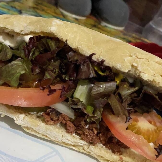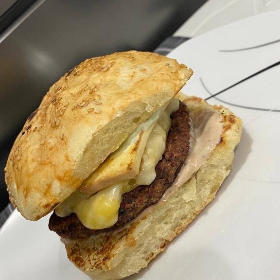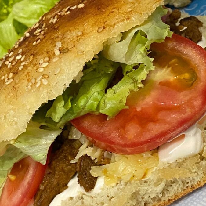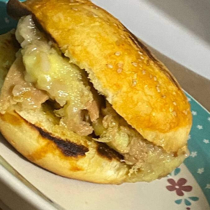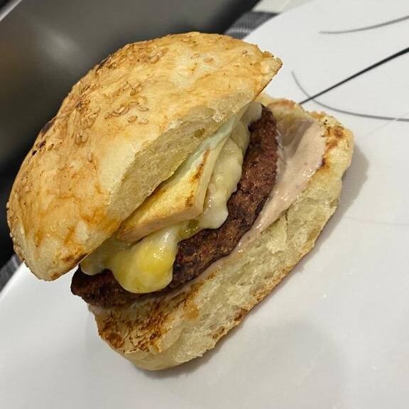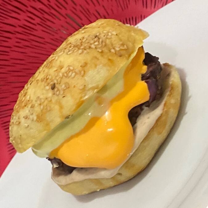 Mixto Quente Veg : pão de hambúrguer(do Vagão fabricação artesanal própria) na chapa, 2 fatias presunto vegano na chapa; queijos vegetais derretidos (bastante)… uma delícia