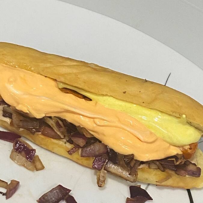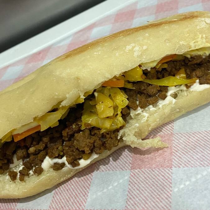 Pão Especial do Vagão (150g), Repolho Refogado com Cenouras, Carne Moída Vegetal refogada com pimentões e especiarias especiais importadas, Molho Brown do Vagão (base barbecue) e Molho Yellow do Vagão (base mostarda).