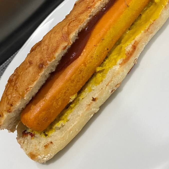 Pão especial dog dovagão (120g), 1 salsicha viena goshen 15cm, molho cheddar do Vagão, maionese hellmans vegana, mostarda hellmans e ketchup hellmans; acompanha potinho com batata palha.