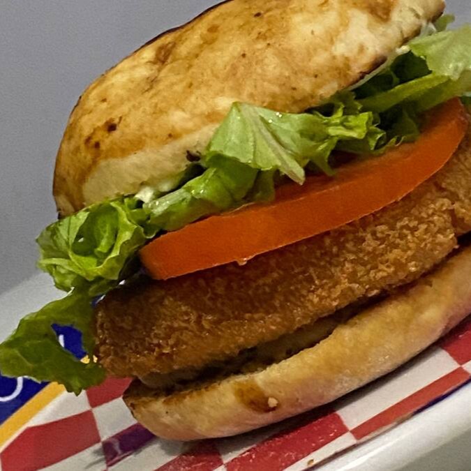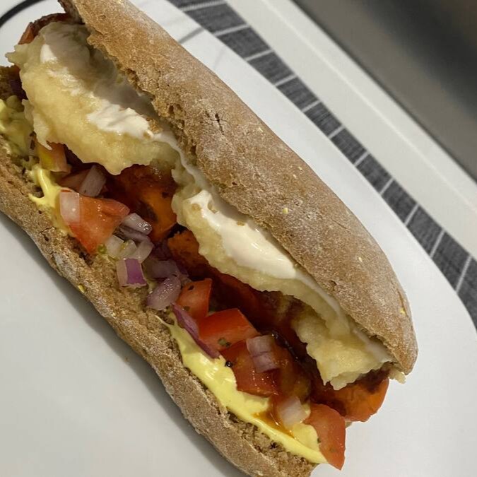 Pão, Hambúrguer de Frango Veg frito (100g), Alfaces picadas, fatias de tomate, cebolas fatiadas; molhos brown e yellow.
