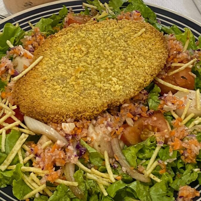 Steak de frango veg frito (100g); alfaces, tomates, palmitos, repolhos, cenouras picados e cebolas fatiadas; coberto com