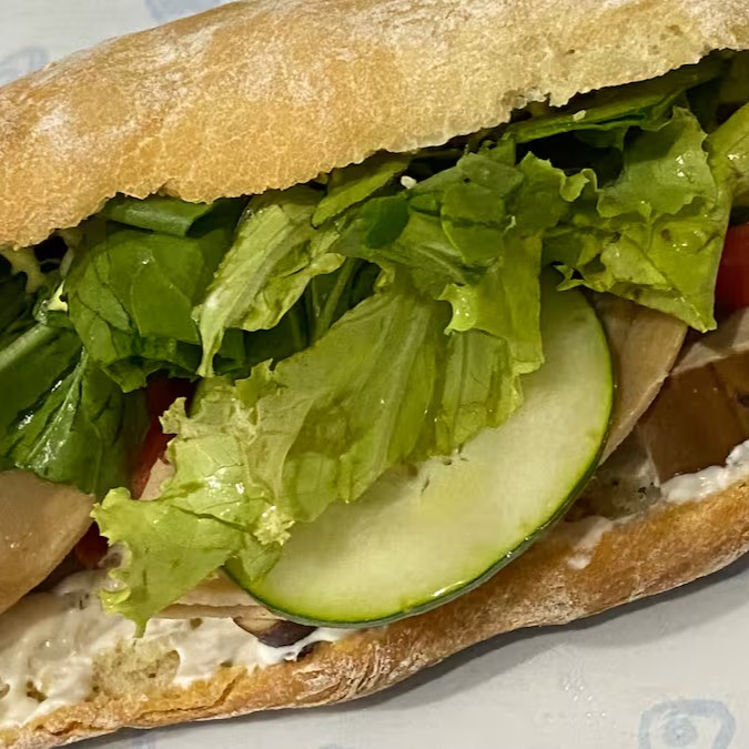 Pão Especial do Vagão (150g),Vegetais Selecionados (Salada de Alface + Rúcula, Tomates, Pepinos Picles), Presunto Defumado Veg, Tofu Defumado, Molho Yellow do Vagão (base mostarda) e Molho Brown do Vagão (base barbecue).