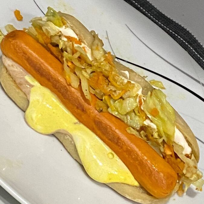 Pão especial dog dovagão (120g), 1 salsicha viena goshen 15cm, refogado de repolho e cenoura, maionese hellmans vegana, mostarda hellmans e ketchup hellmans; acompanha potinho com batata palha.