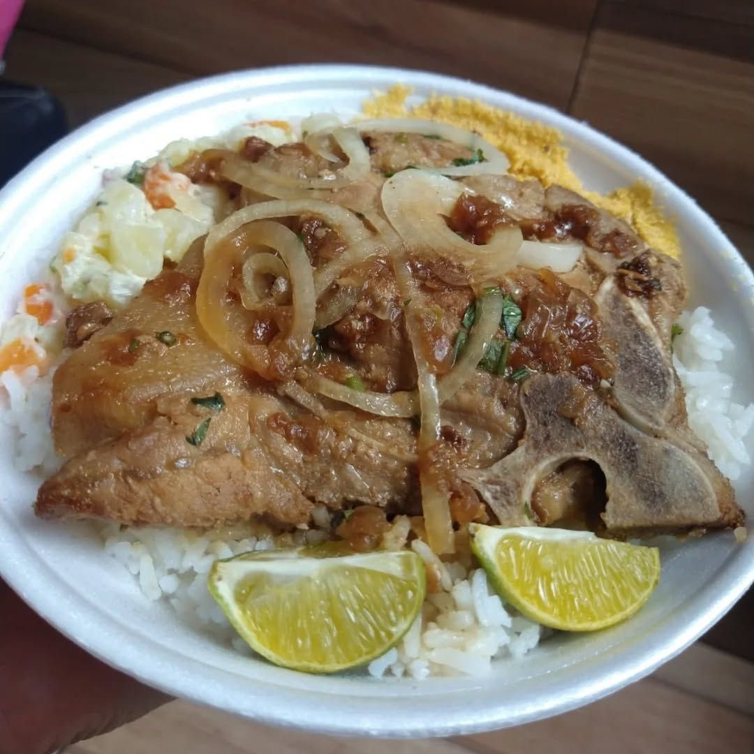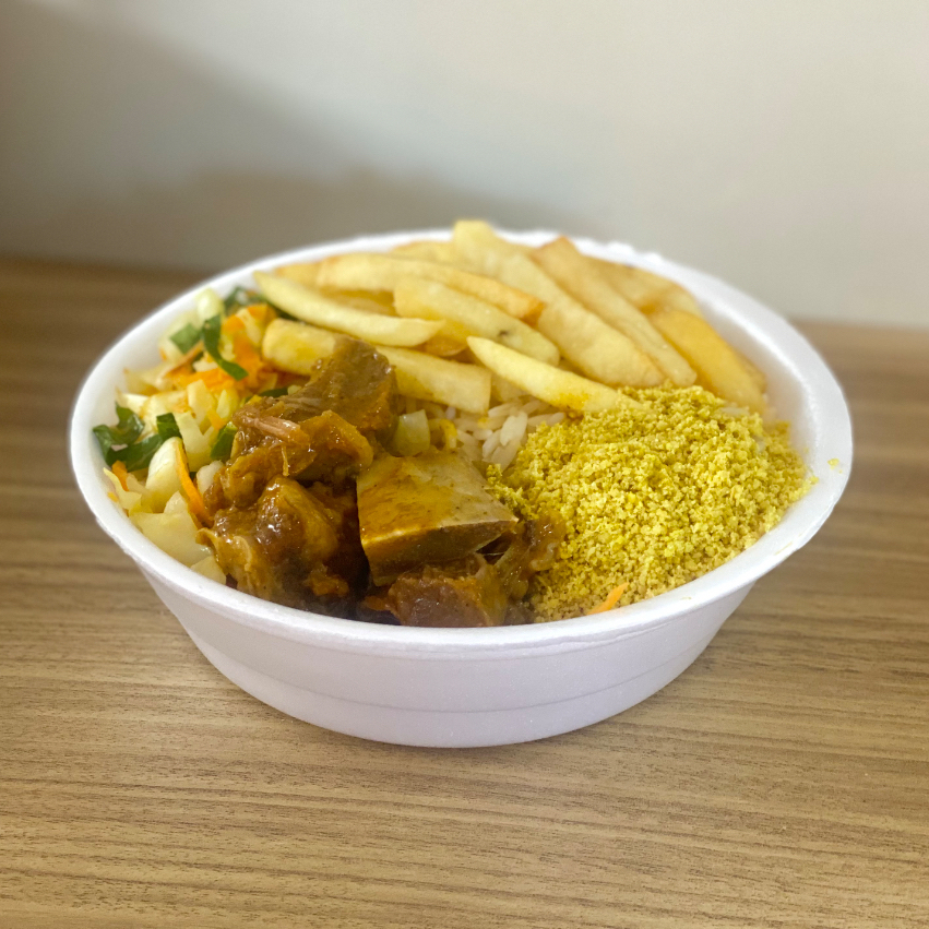 Costelinha bovina, Feijão, arroz, macarrão, farofa, vinagrete e batata frita