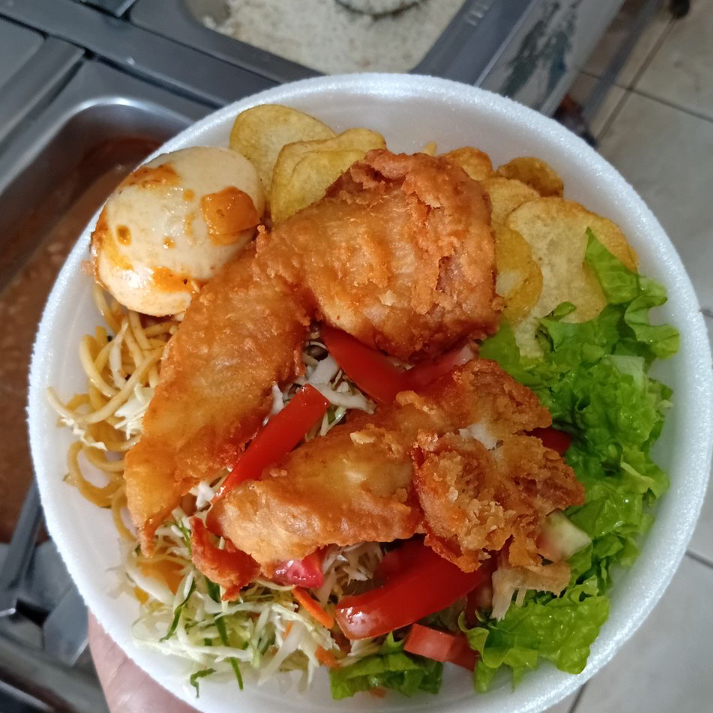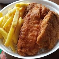 Filé de rosado frito, Feijão, arroz, macarrão, farofa, vinagrete e batata frita