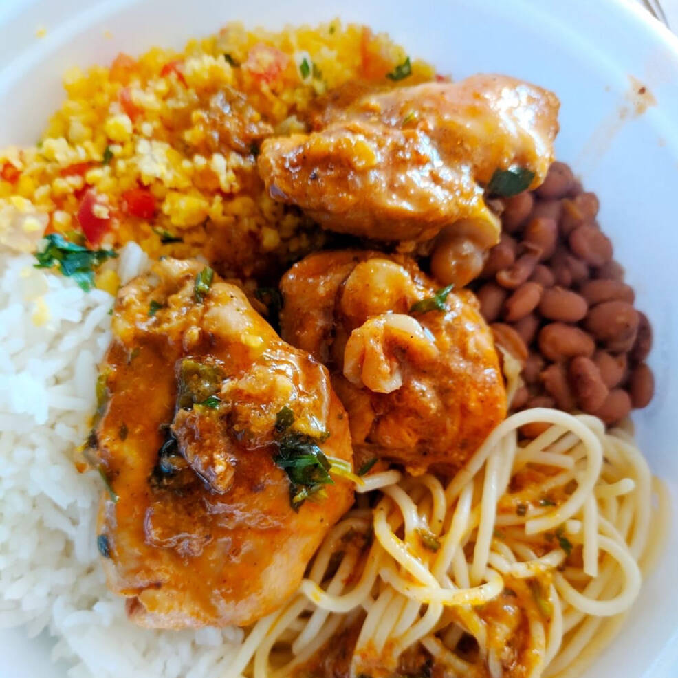 Frango de panela, Feijão, arroz, macarrão, farofa, vinagrete e batata frita