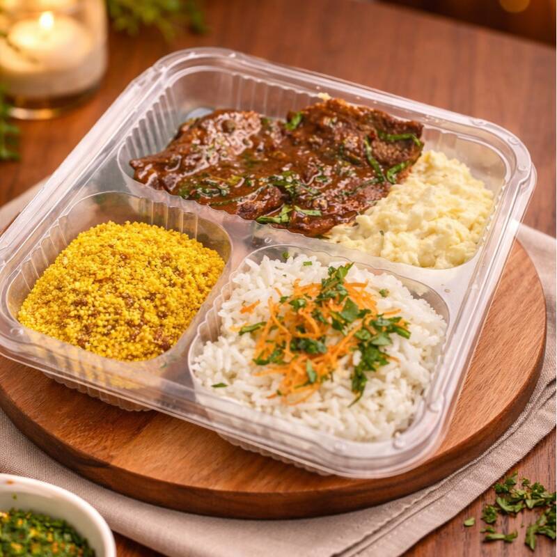 Carne selecionada selada na manteiga de ervas e shoyu, macia e cheia de sabor. Servida com arroz branco soltinho, feijão da casa, purê rústico e farofa artesanal.