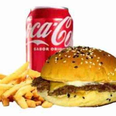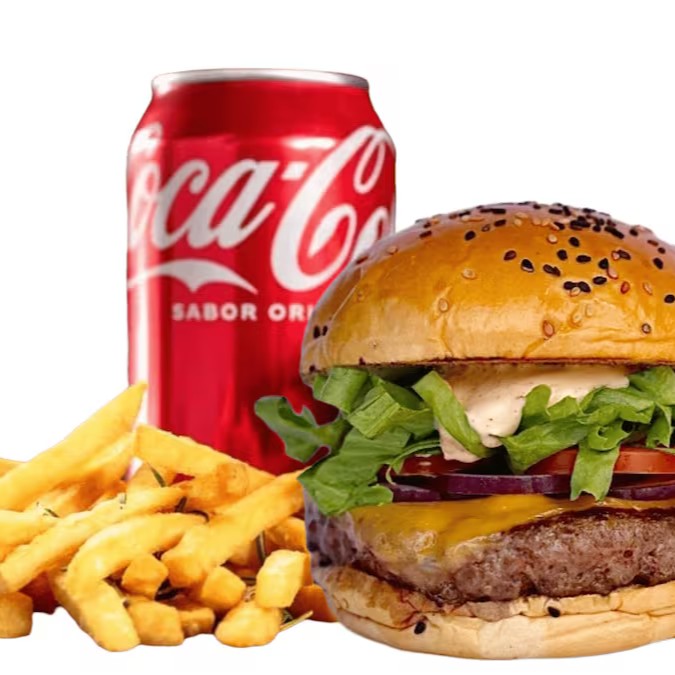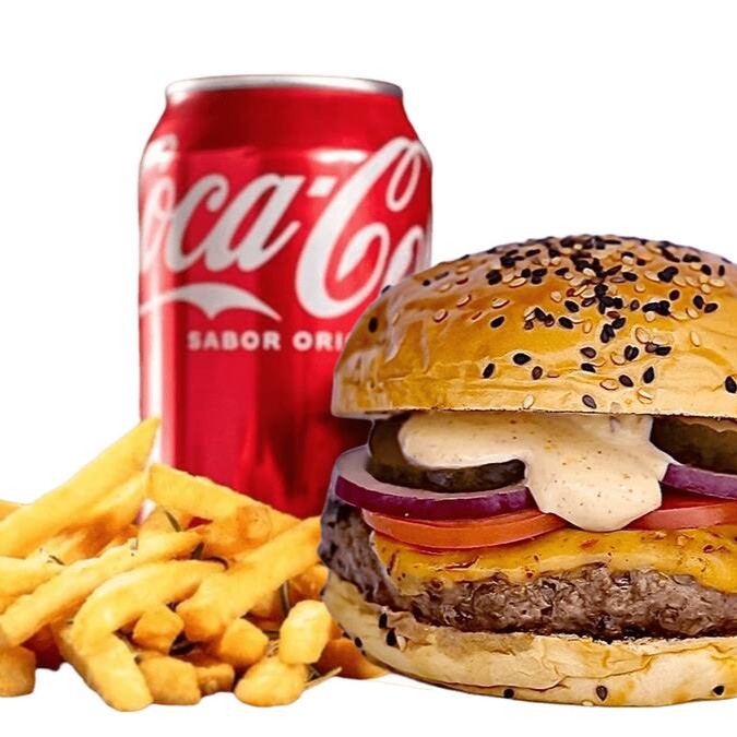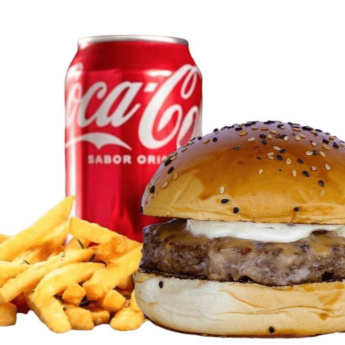 Burger Angus 150g, american cheese, alface, tomate, cebola e maionese no pão brioche + Batata e Bebida.