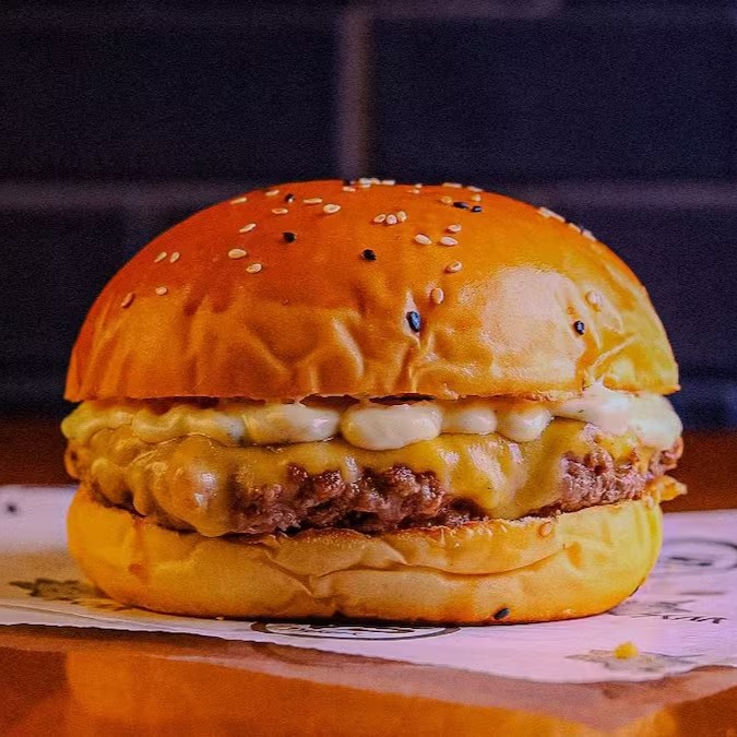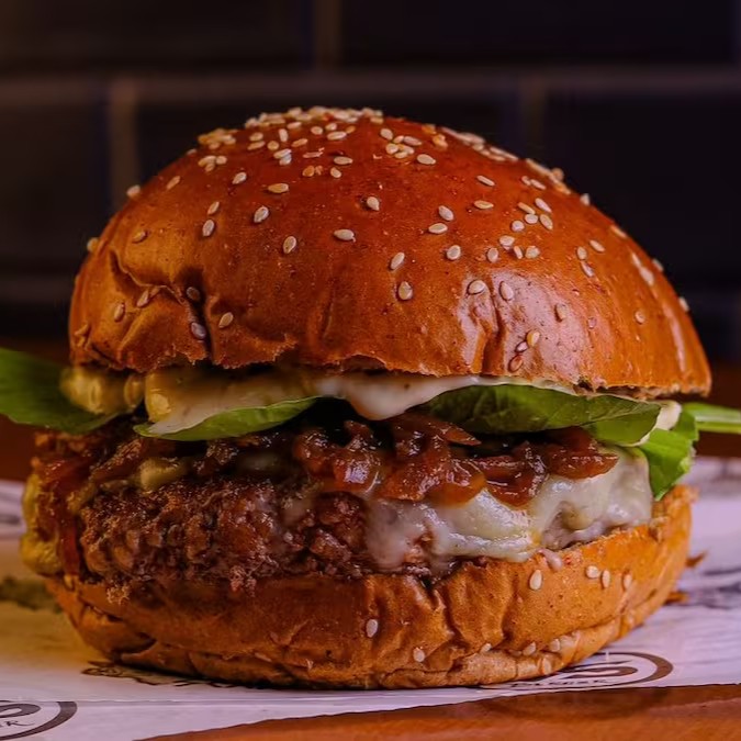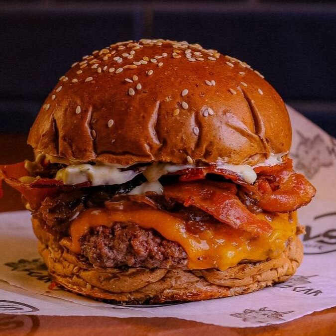 Burger 160g, american cheese, cebola caramelizada, bacon e maionese no pão australiano.