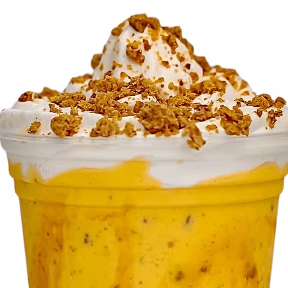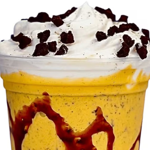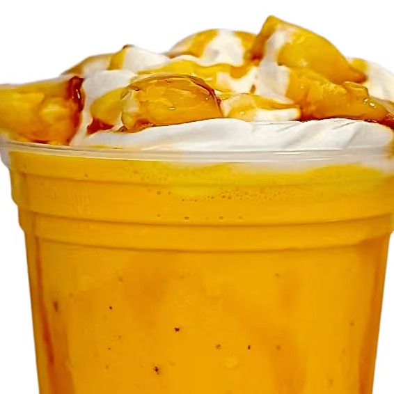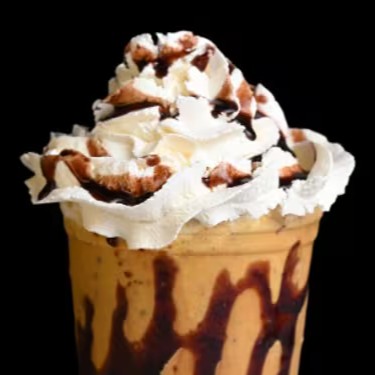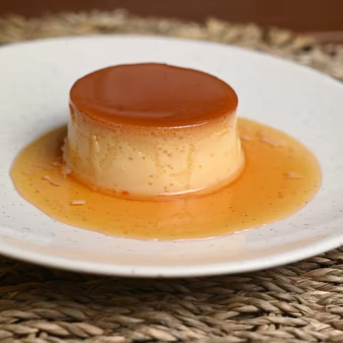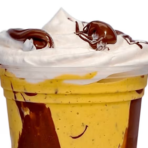 Base de sorvete, leite, pudim em pedaços, caramelo.