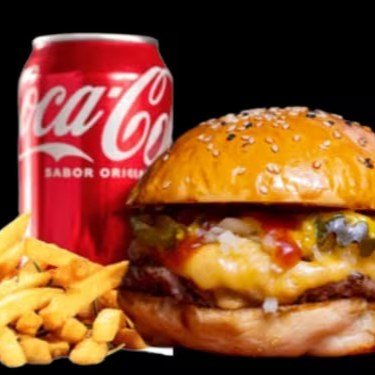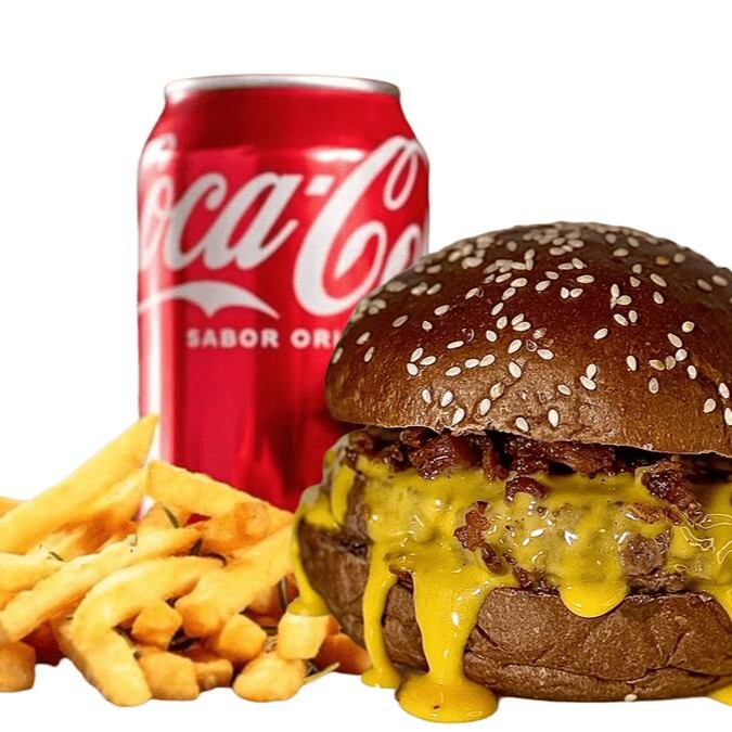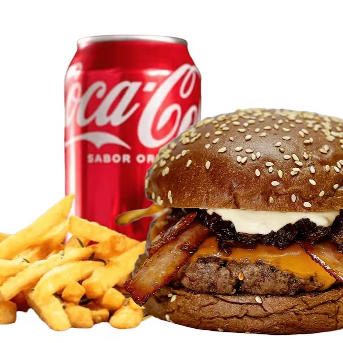 Burger Angus 150g, american cheese, cebola caramelizada, bacon e maionese no pão australiano + batata e bebida