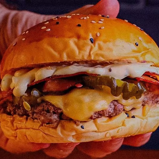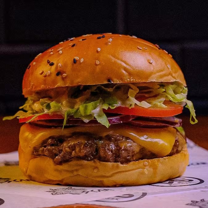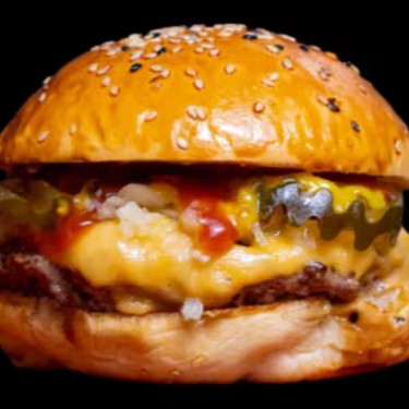 Burger Angus 160g, american cheese, 2 fatias de bacon, picles e maionese no pão brioche.
