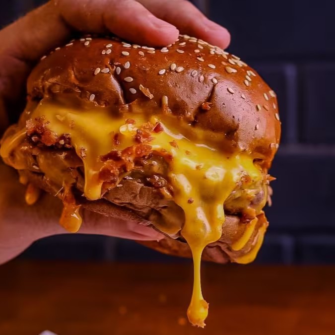 Burger 160g, queijo cheddar cremosos, farofa de bacon no pão australiano.