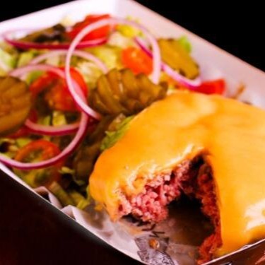 Alface americana, tomate cereja, pickles, cebola roxa com burger 160g e american cheese.
