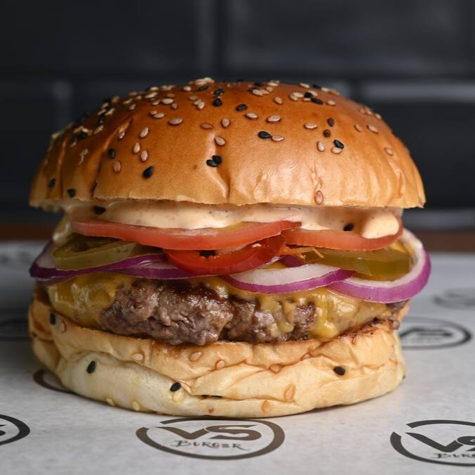 Burguer 160g, american cheese, jalapeño, cebola roxa, tomate, maionese picante no pão brioche.