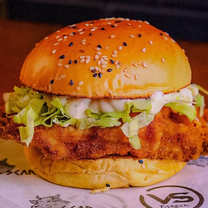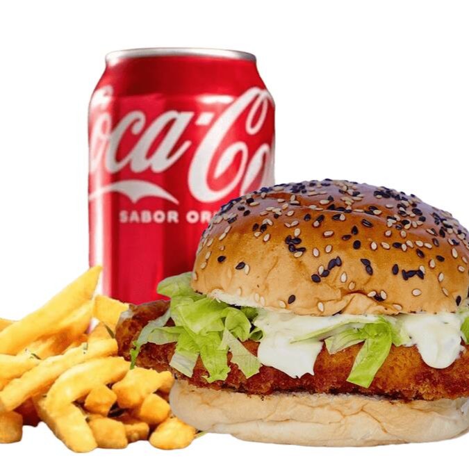 Burger de frango empanado, alface picada e maionese no pão brioche + batata e bebida.