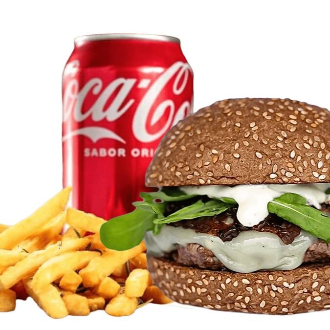 Burger 160g, blue cheese/gorgonzola, cebola caramelizada e rúcula no pão australiano + batata e bebida.