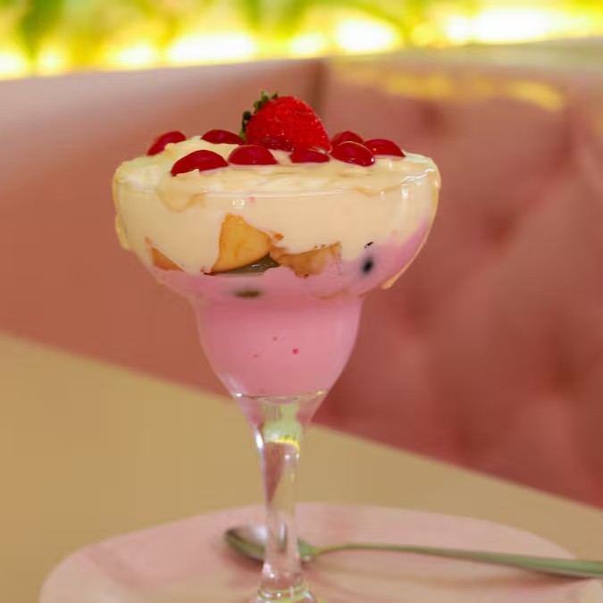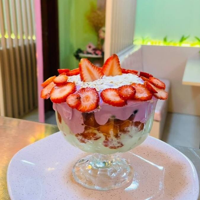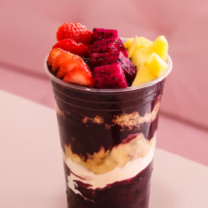 Acompanha morango, manga, pitaya e banana — você pode retirar qualquer fruta.