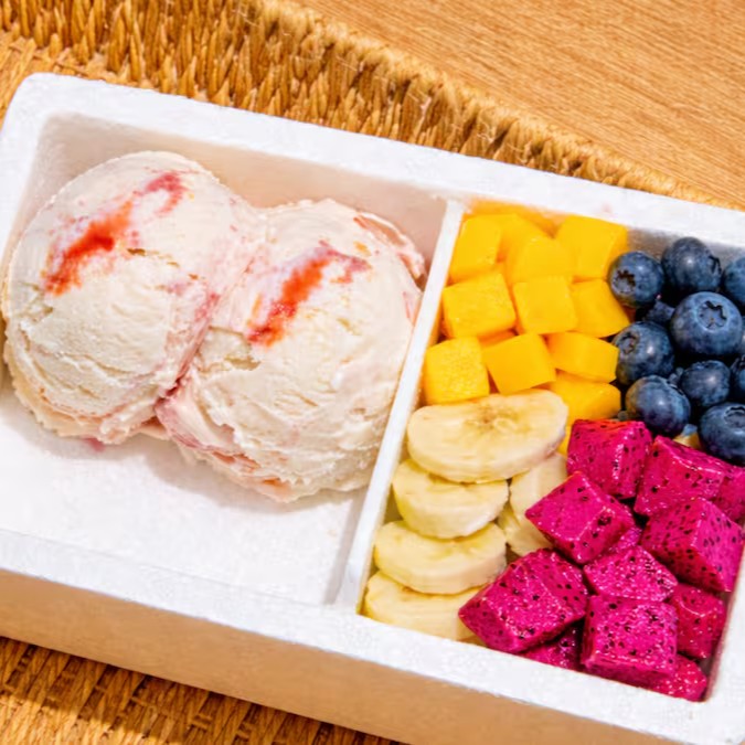 2 bolas de sorvete cremoso montado com frutas frescas e complementos à sua escolha. Uma combinação equilibrada, bem servida e perfeita para compartilhar ou aproveitar sozinho. (Imagem Ilustrativa)
