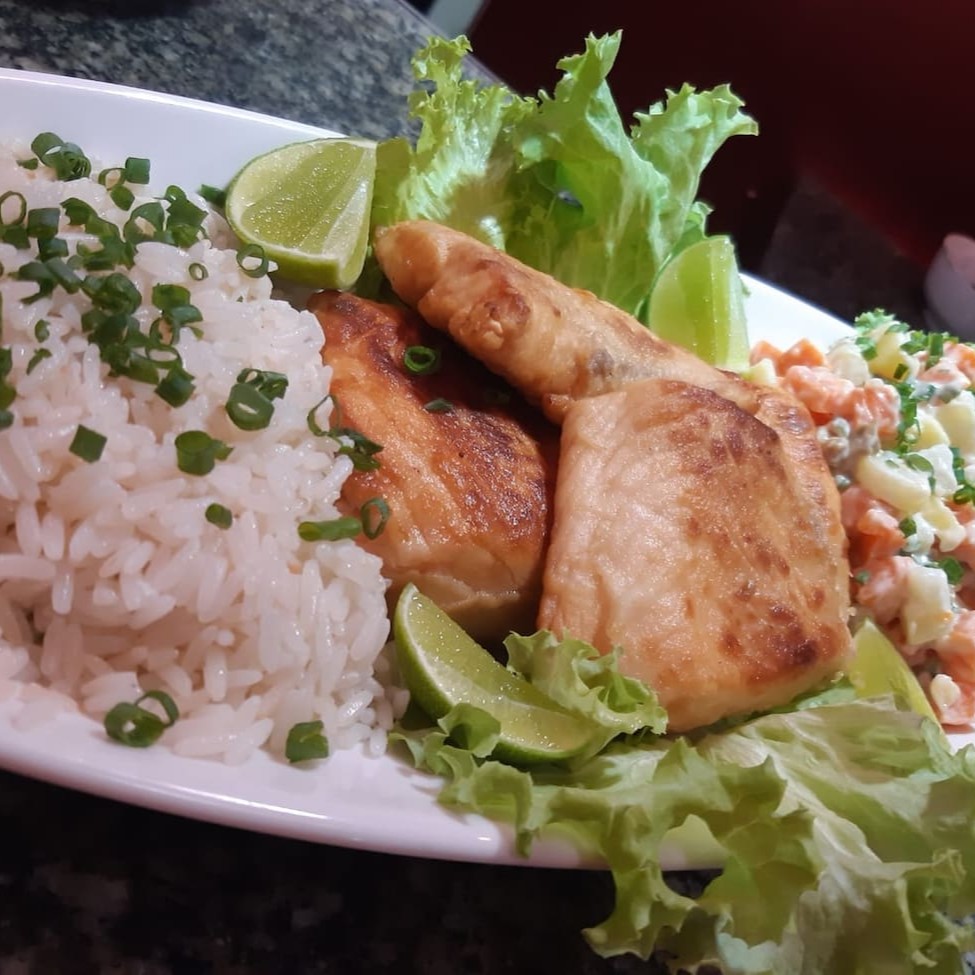 Acompanha Arroz branco e salada de maionese, serve 1 pessoa