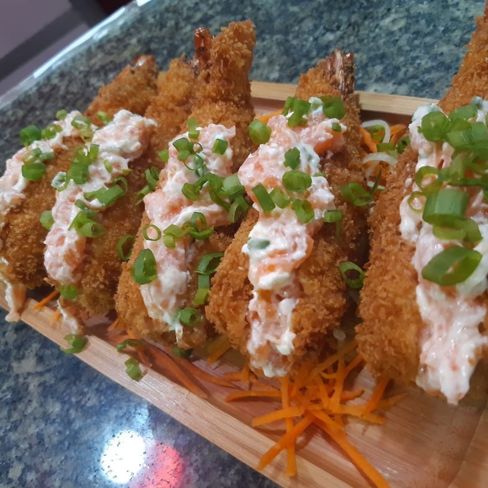 5 camarão empanado na farinha panko recheados com salmão, cream cheese e cebolinha