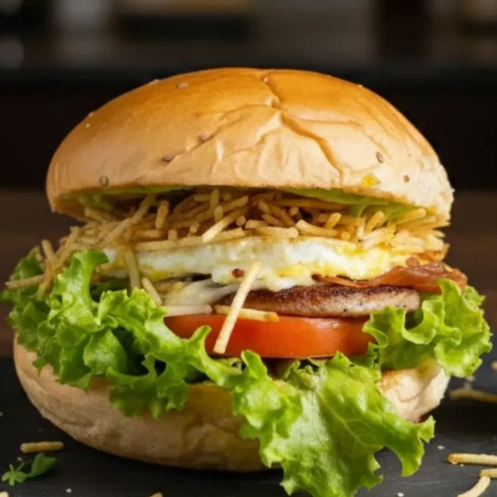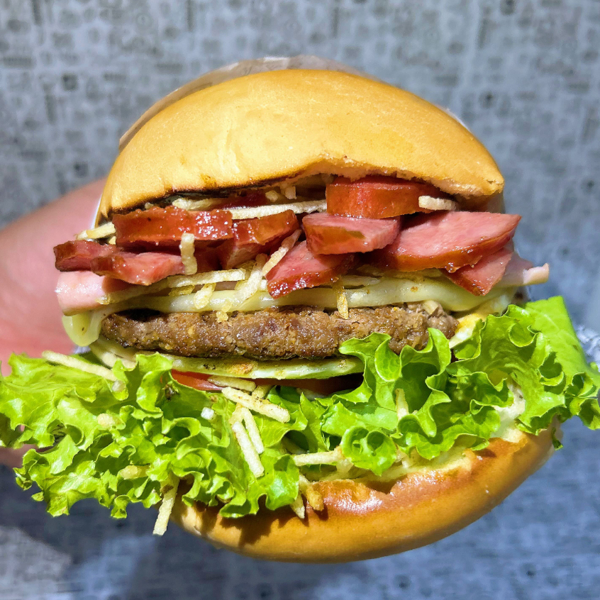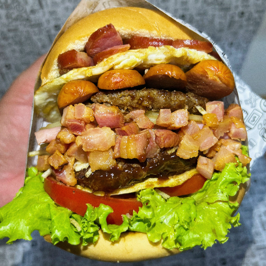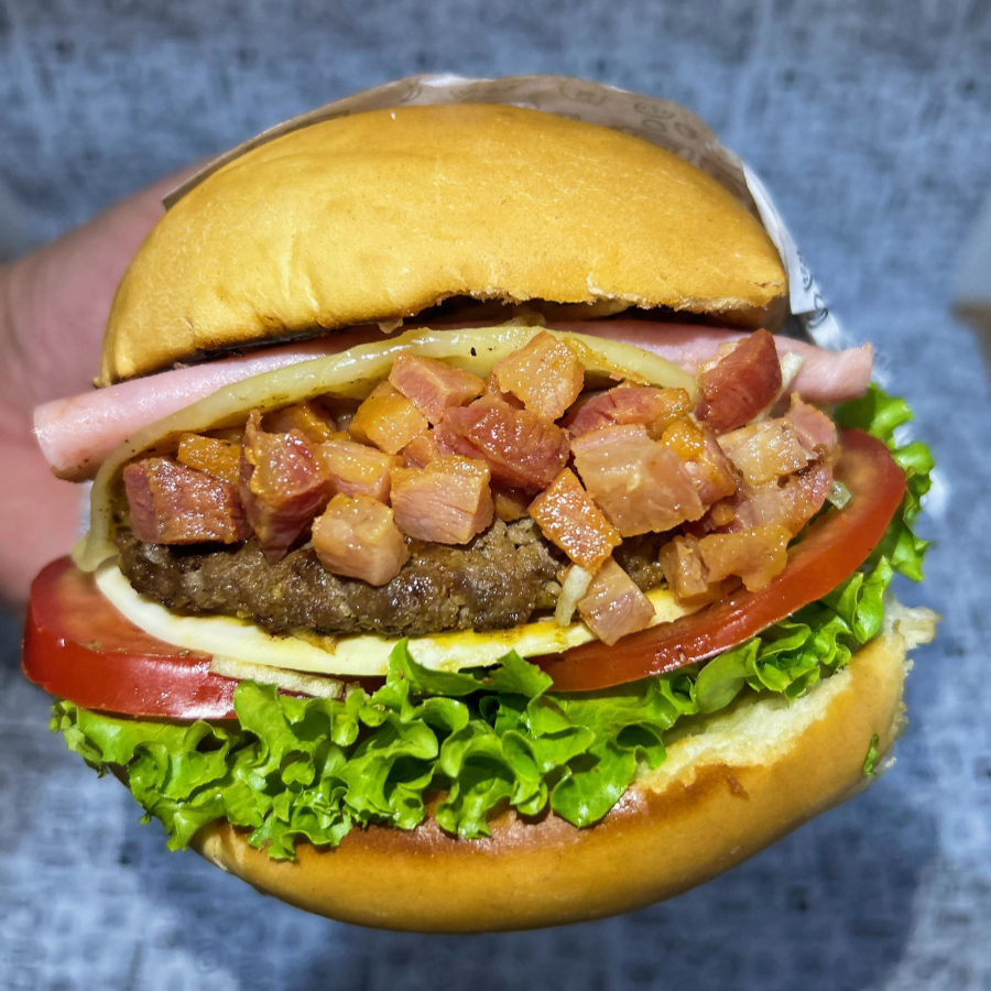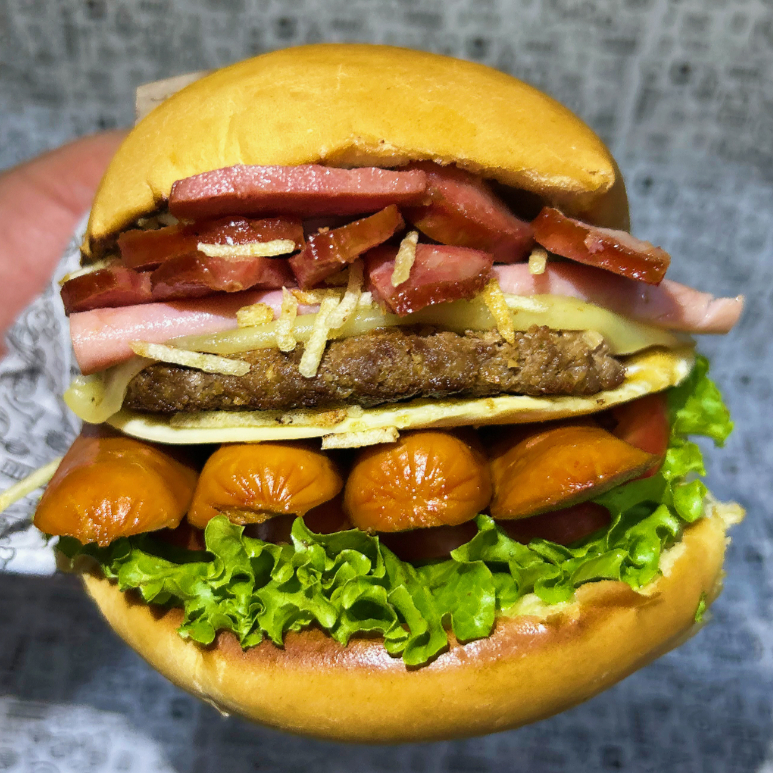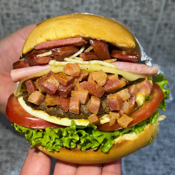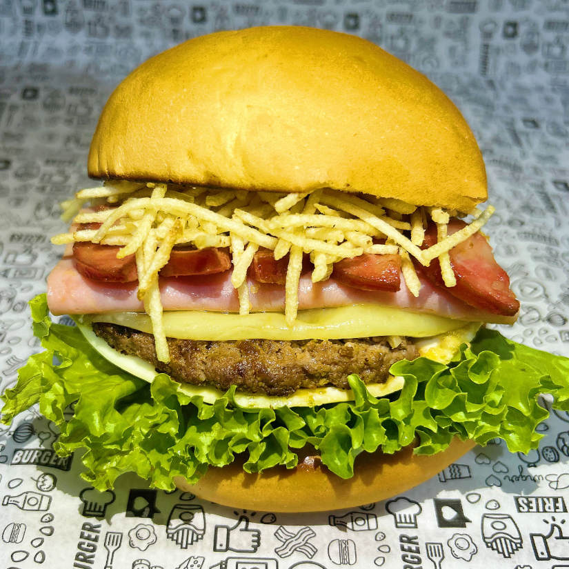Pão bola, carne, duplo bacon, ovo, queijo, presunto, batata palha, molho da casa, salada (alface, tomate e pepino).