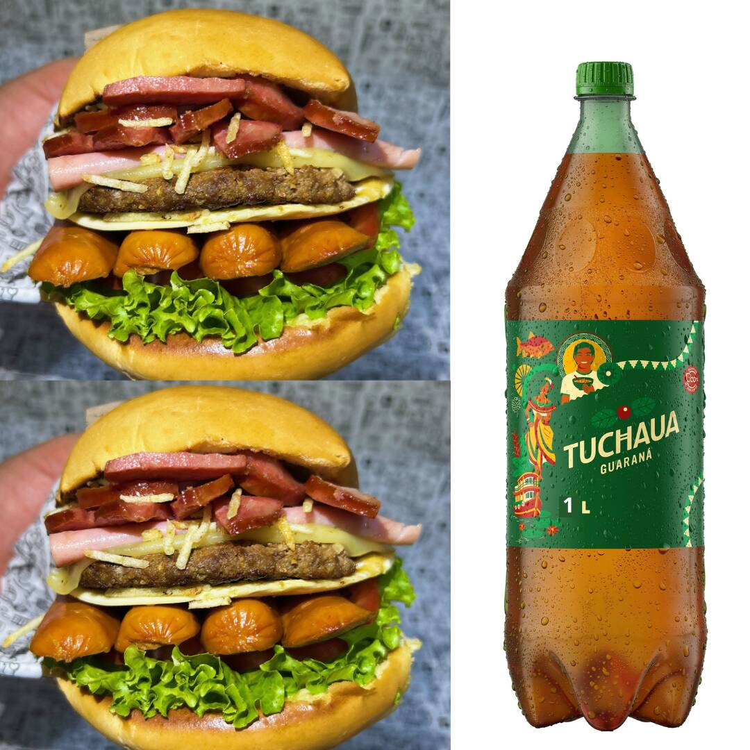 2 Hambúrguer Super Especial (Pão, carne, ovo, queijo, presunto, calabresa, salsicha, batata palha, salada) e um Guaraná Tuchaua de 1L