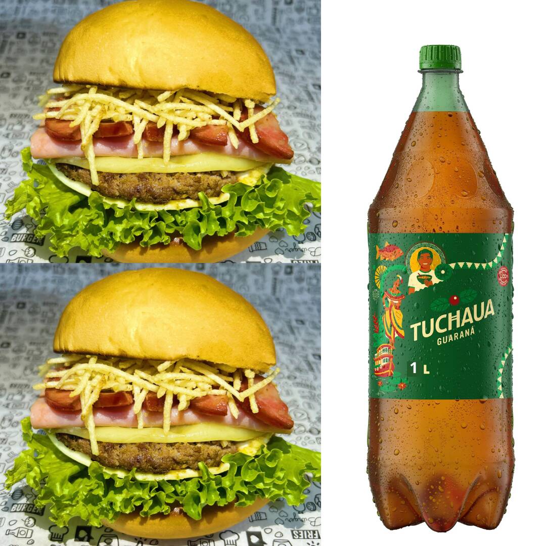 2 Hambúrguer Especial (Pão, carne, ovo, queijo, presunto, calabresa, batata palha, salada) e um Guaraná Tuchaua de 1L