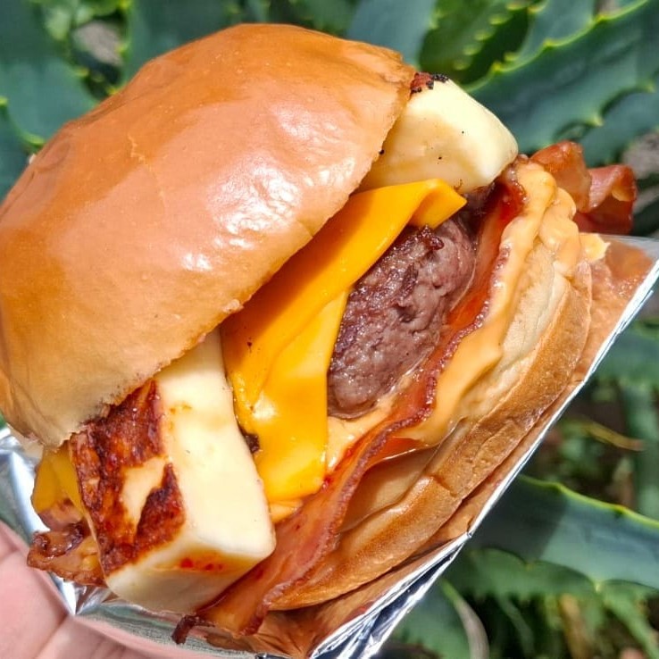 Pão selado na manteiga,molho da casa,hambúrguer,cheddar,queijo coalho e molho de pimenta agridoce defumada.