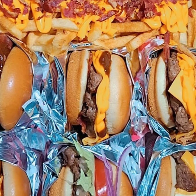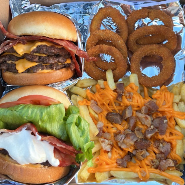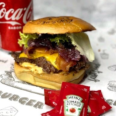 Acompanha 2 burguer da sua escolha + batata frita cheddar e bacon+anel de cebola + 1 coca 600ml, molho verde e ketchup heinz
