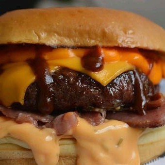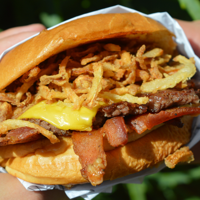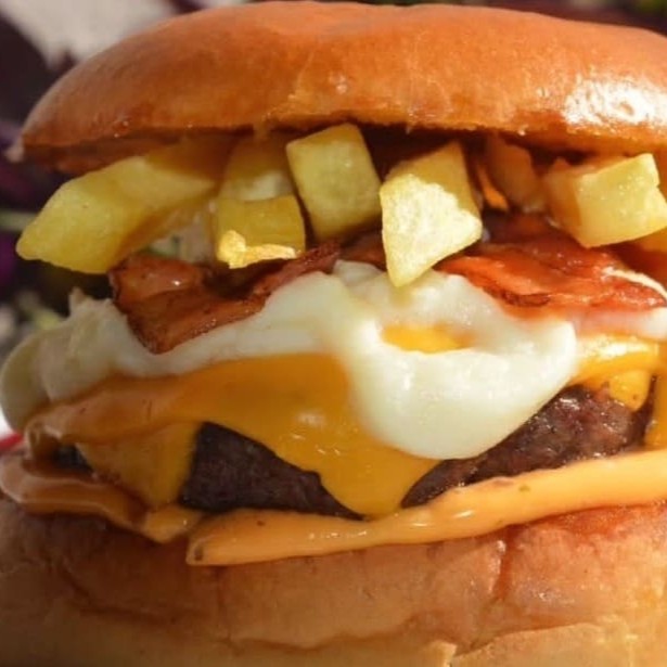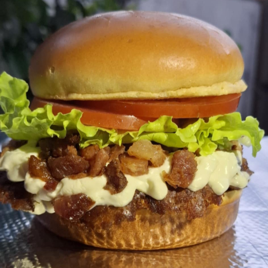Pão selado com manteiga,molho da casa,cama de bacon,burguer smash,queijo prato e cebola crispy