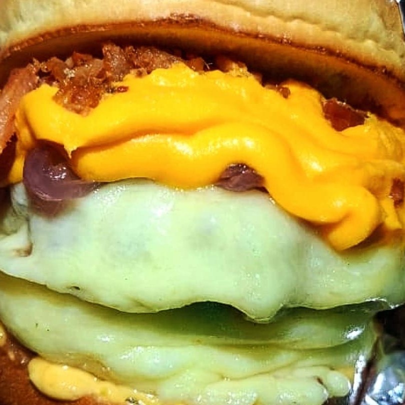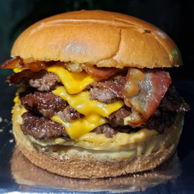 Pão selado com manteiga, molho da casa, triplo hambúrguer artesanal Smash,provolone e bacon em cubos