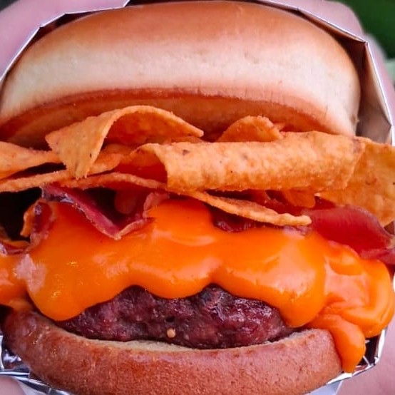 Pão selado com manteiga, molho da casa, hambúrguer artesanal, cream chese,bacon,Doritos
