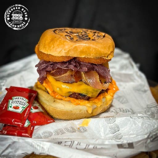 Pão selado com manteiga, molho da casa, 2 hambúrguer artesanal,duplo cheddar,bacon,cebola caramelizada,2 anéis de cebola