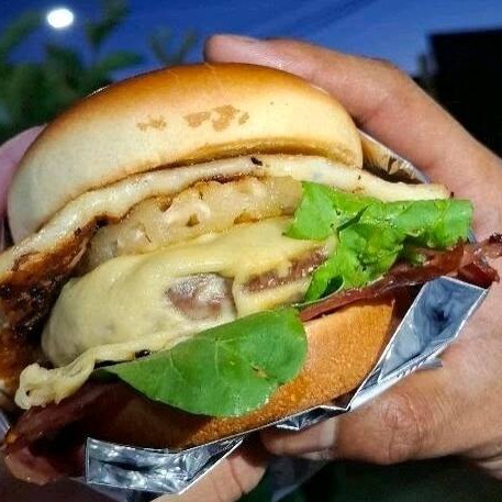 Pão Selado Na Manteiga, Molho Da Casa,Cama De Bacon, Rúcula, Hambúrguer, Queijo Prato, Abacaxi Chapeado, Queijo Coalho E Mel.