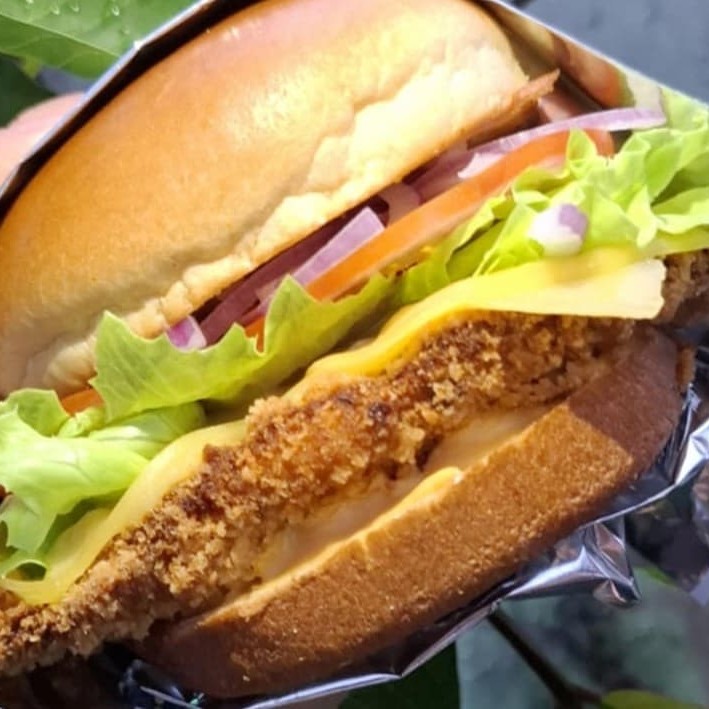 Pão selado na manteiga, molho da casa, frango empanado,queijo prato, alface, tomate, cebola roxa