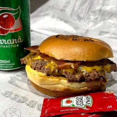 Pão selado com manteiga, molho da casa,hambúrguer smash,cheddar,bacon,cebola caramelizada,alface,tomate. (NÃO ACOMPANHA REFRIGERANTE)