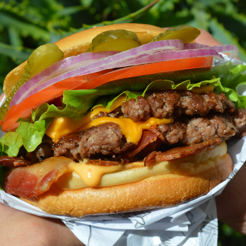 Pão selado com manteiga,molho da casa,cama de bacon,duplo burguer smash,cheddar,alface,tomate,cebola roxa e picles