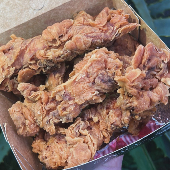 Frango frito preparado na hora, empanado na farinha de trigo, com porção generosa entre 450g e 500g.