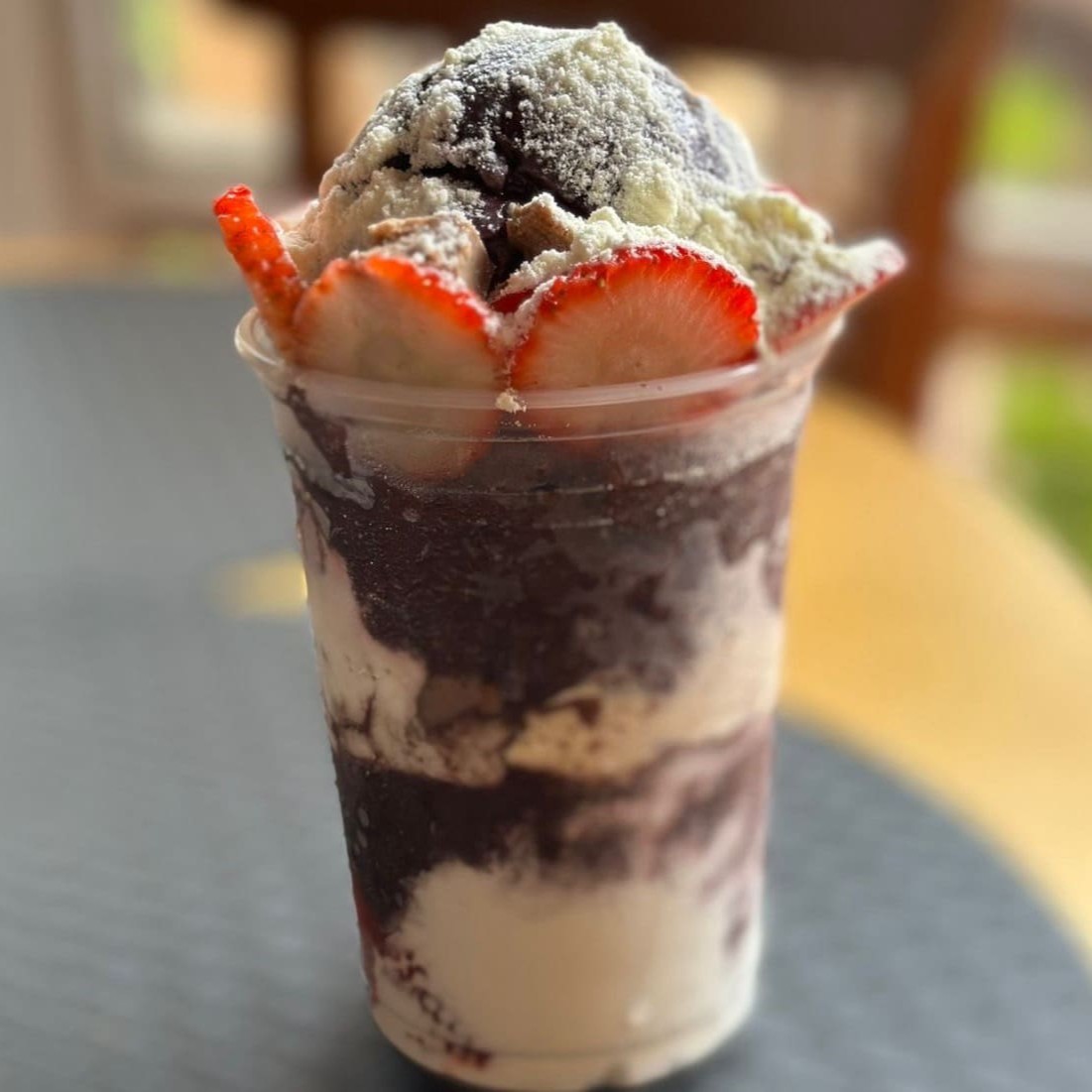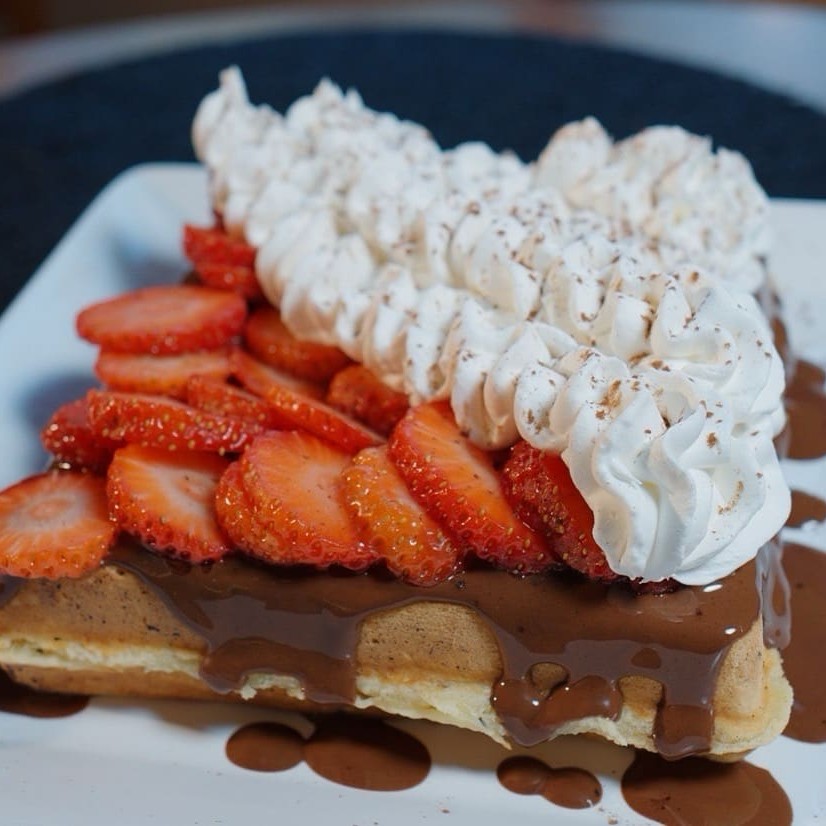Waffle, delicioso chocolate ao leite, morangos frescos e chantilly.