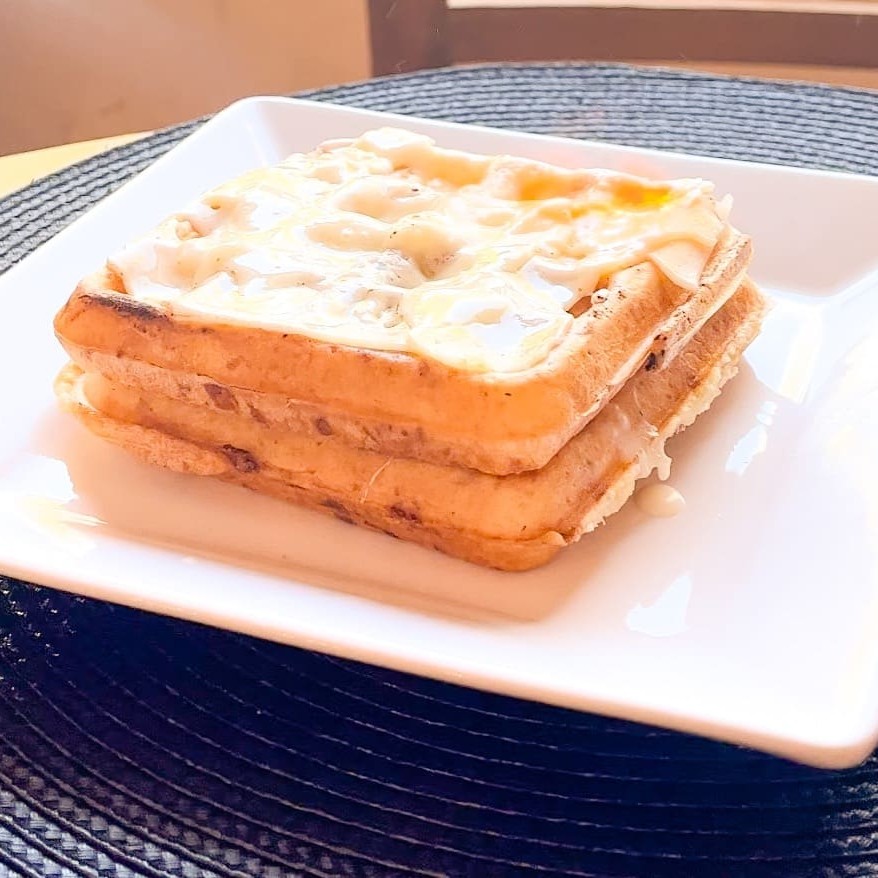 Delicioso Waffle, presunto, queijo e muçarela gratinada