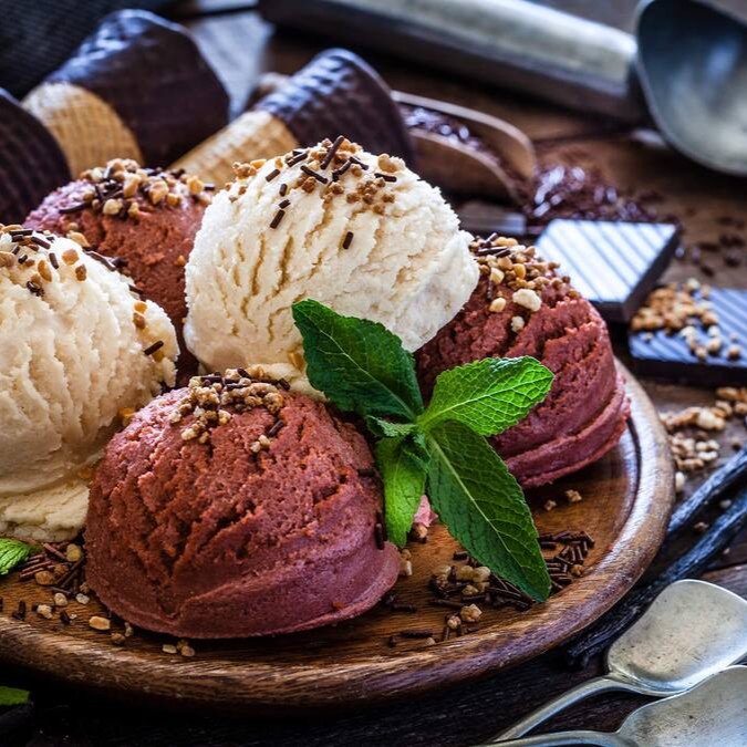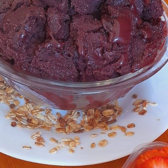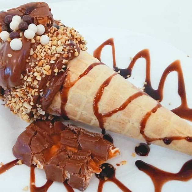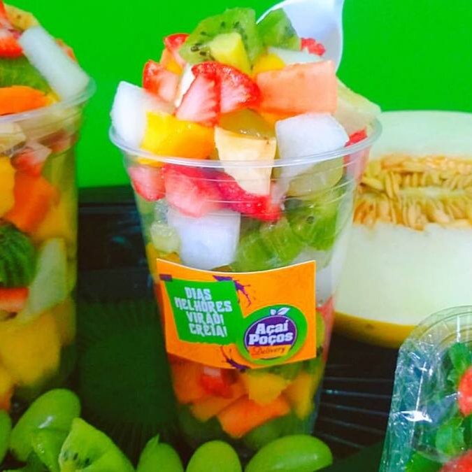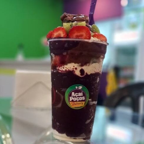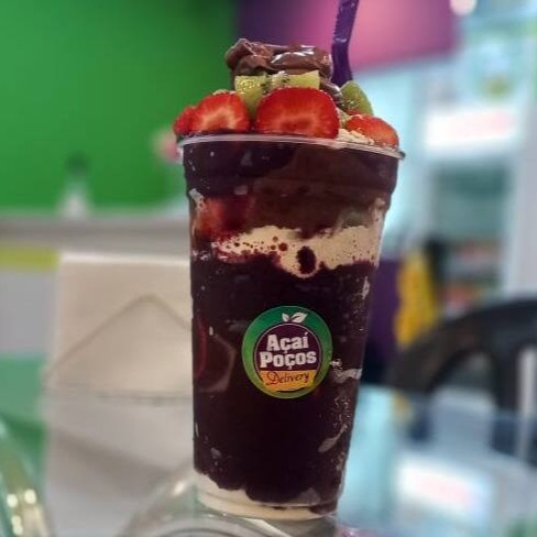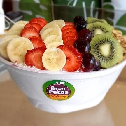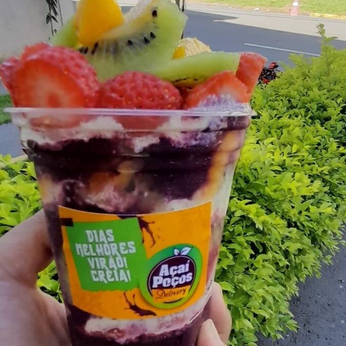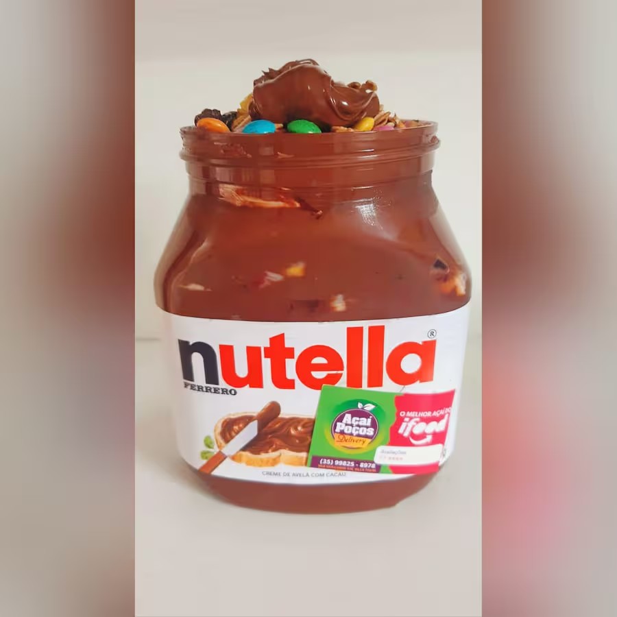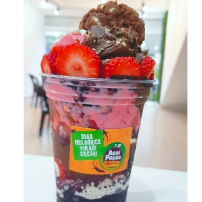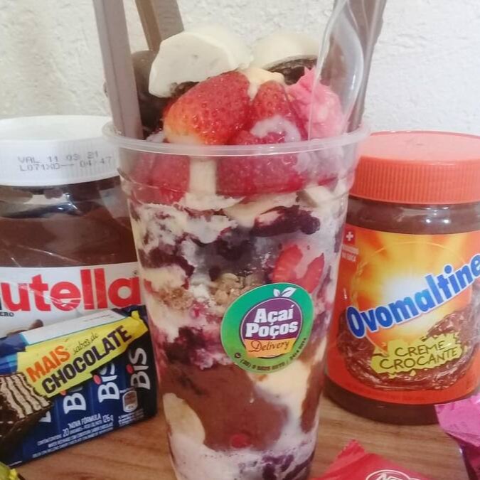 Açaí, banana, morango, leite em pó, granola, leite condensado, Confete e Nutella.