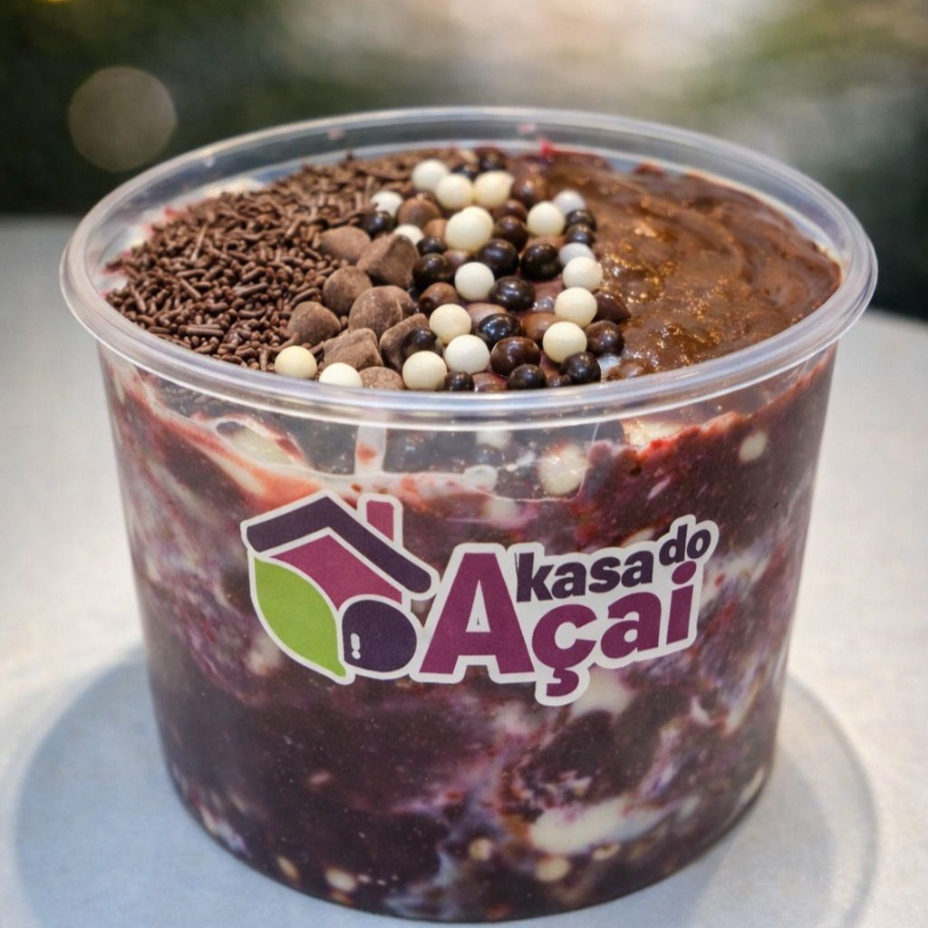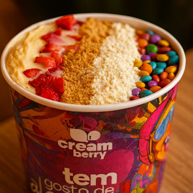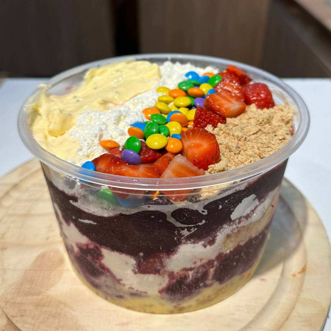 Açaí tradicional super cremoso com a leve acidez da mousse de maracujá, pedaços fresquinhos de morango, a crocância da paçoca, disqueti colorido e finalizado com leite em pó.