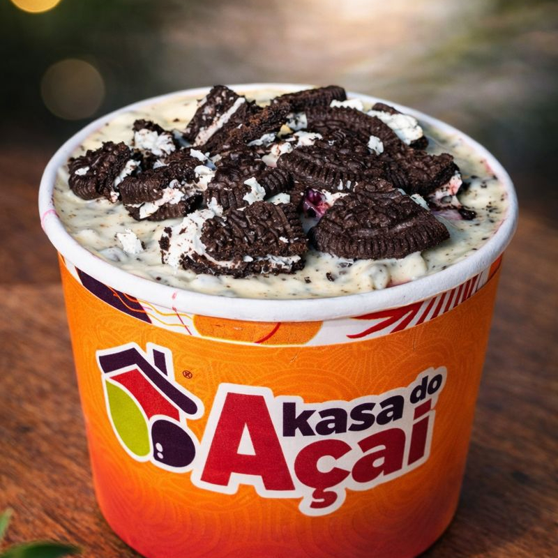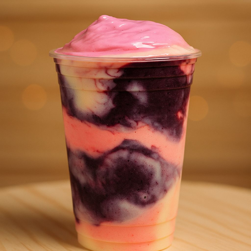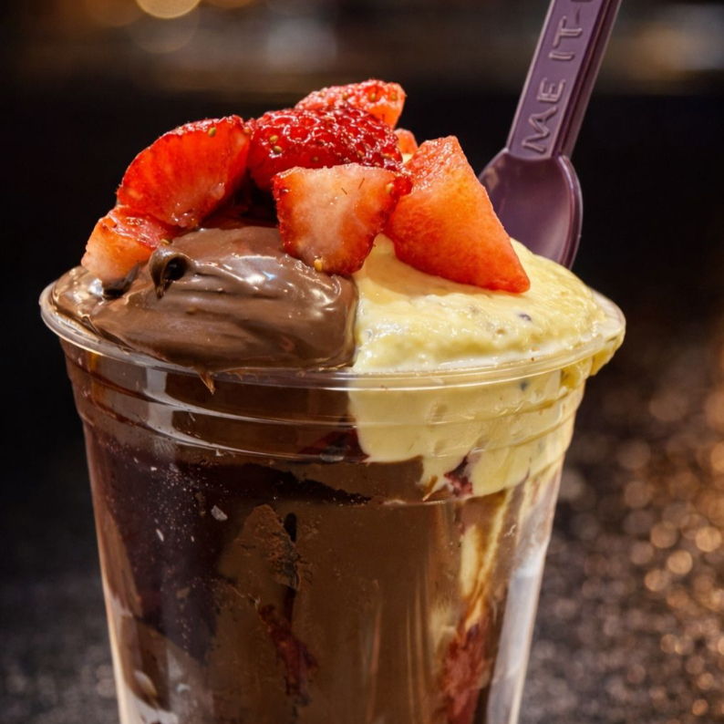 .Açaí tradicional cremeso com mousse de morango , banana, camadas de leite em pó o famoso creme de ninho com toque especial de cobertura de morango