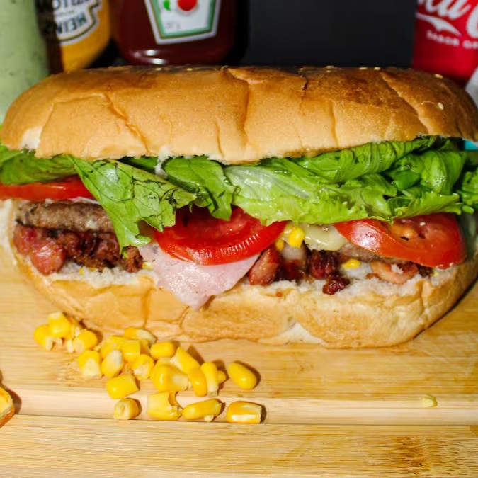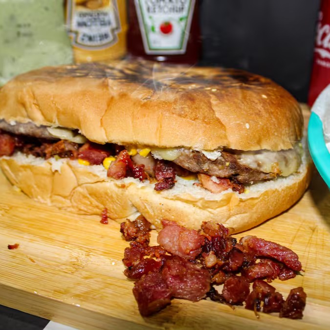 Pão de hambúrguer com gergelim, 120g gramas de hamburguer grossa fatia de mussarela, milho, presunto, bacon crocantes, ovo, alface e tomate.
