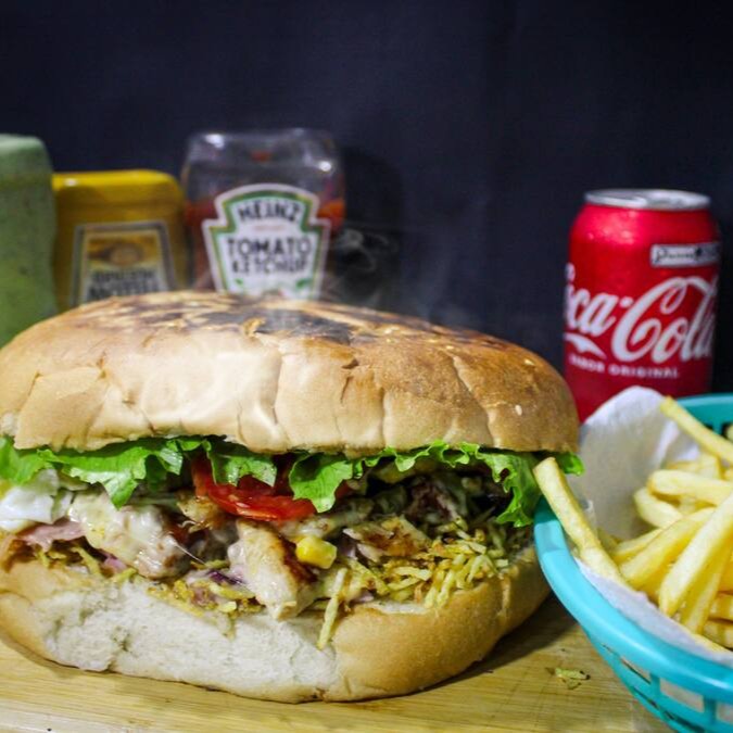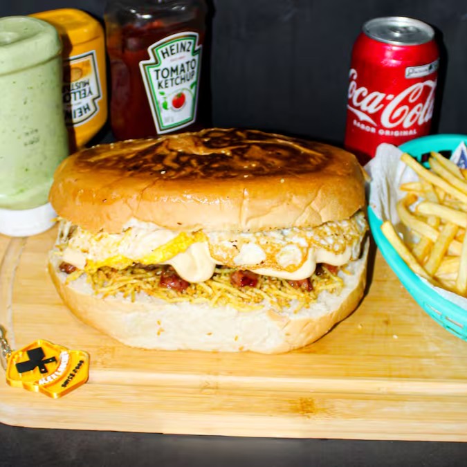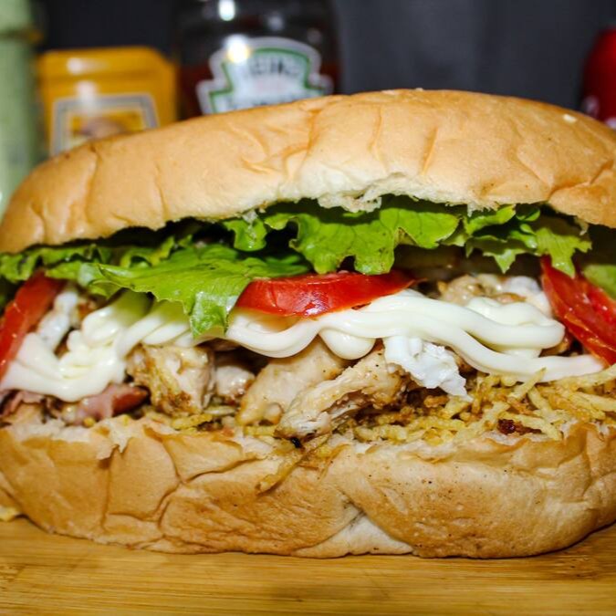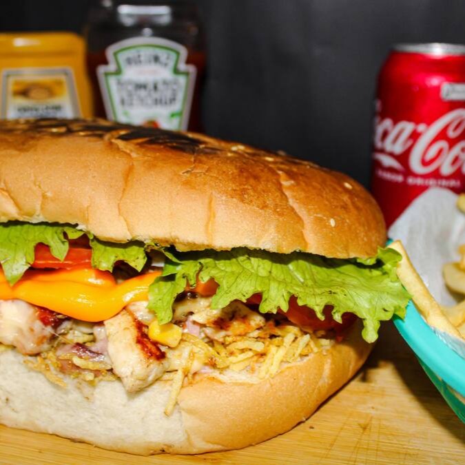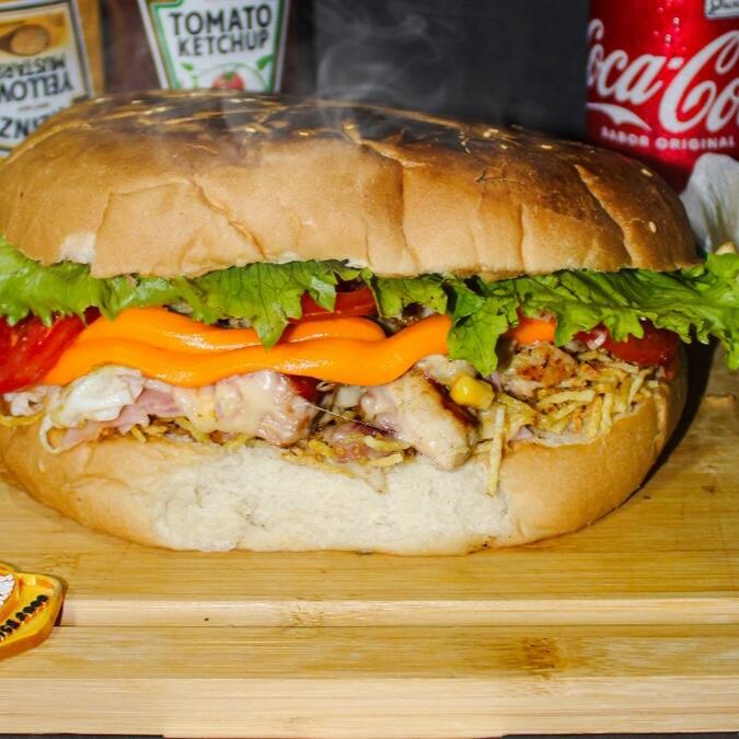 Pão de hamburguer com gergelim, filé de frango, bacon crocantes, milho, grossa fatia de mussarela, presunto, ovo, batata palha, cheddar em exagero, alface e tomate.